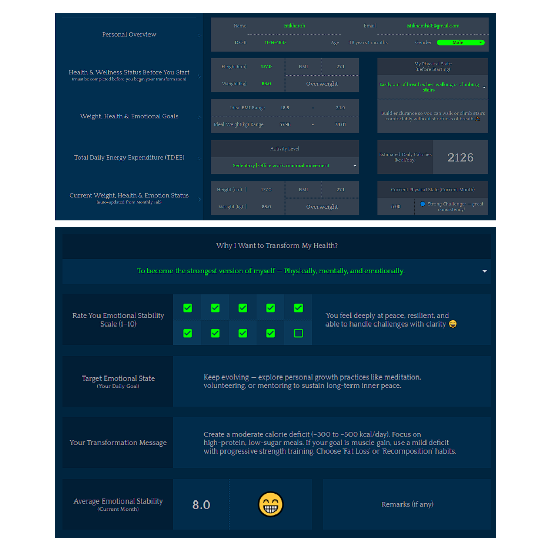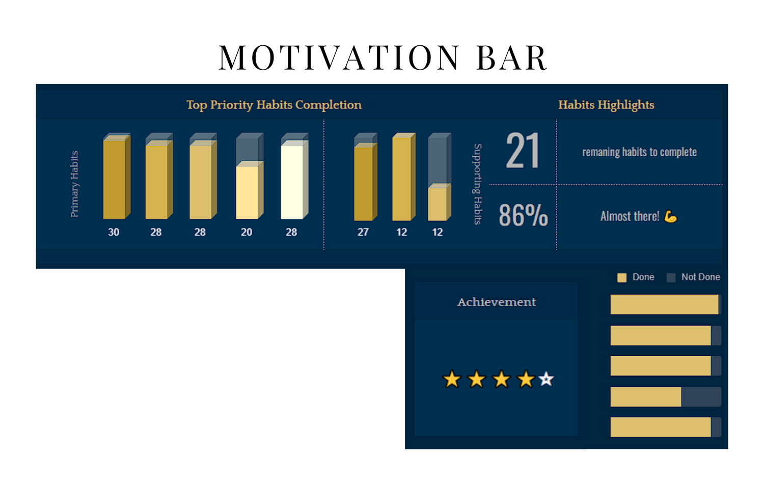 Dengan Motivation Bar yang berubah warna, bintang pencapaian, dan carta emosi yang dijana secara automatik. Setiap usaha kecil diambil kira — lihat tindakan anda bertukar menjadi hasil sebenar.