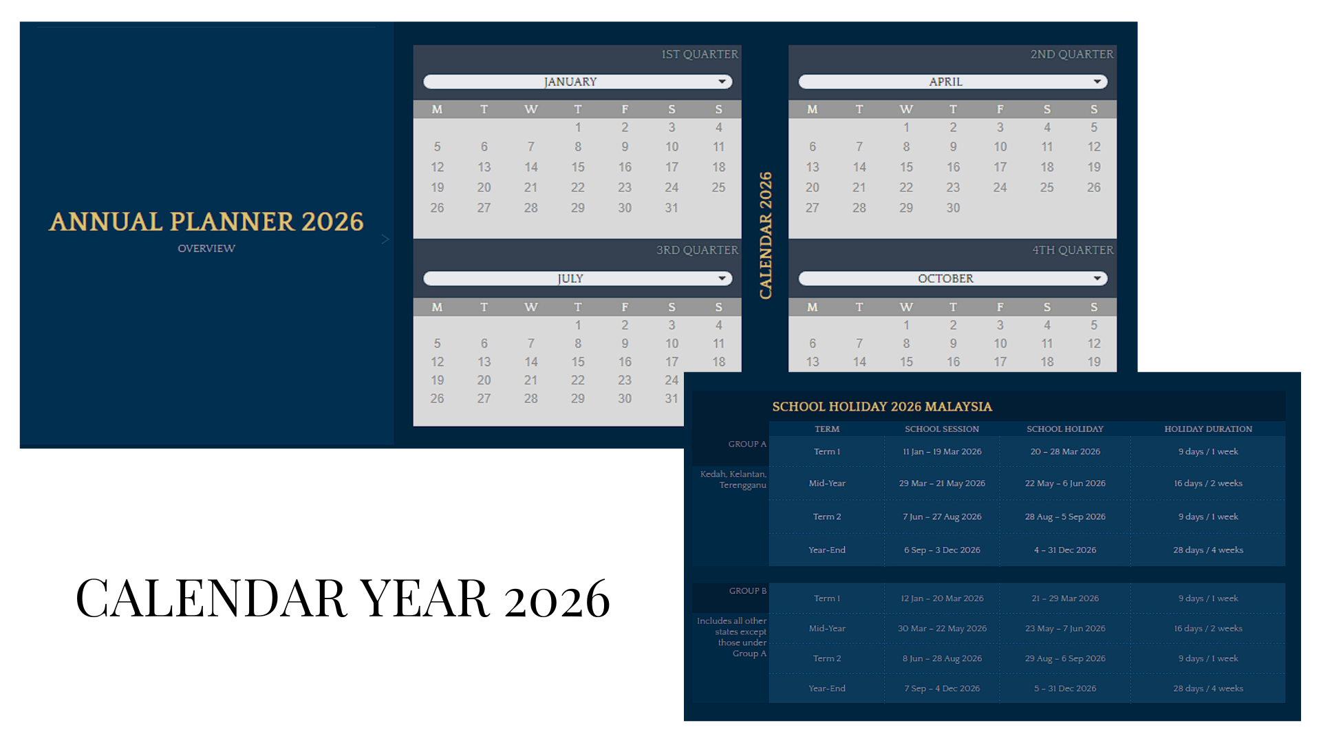 ✅Disusun kemas kepada 4 suku tahunan dan boleh pilih bulan menerusi dropdown, dengan kalendar cuti sekolah dipaparkan mengikut Kumpulan A dan Kumpulan B